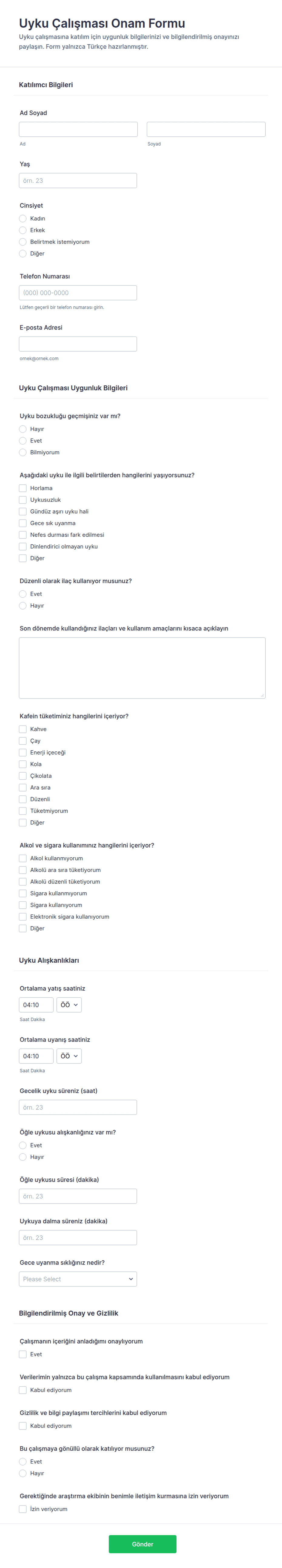 Uyku Çalışması Onam Formu, uyku araştırmalarında katılımcı onayını ve ön değerlendirme bilgilerini online veri toplama ile yönetmek isteyen klinikler ve araştırma ekipleri için uygundur.