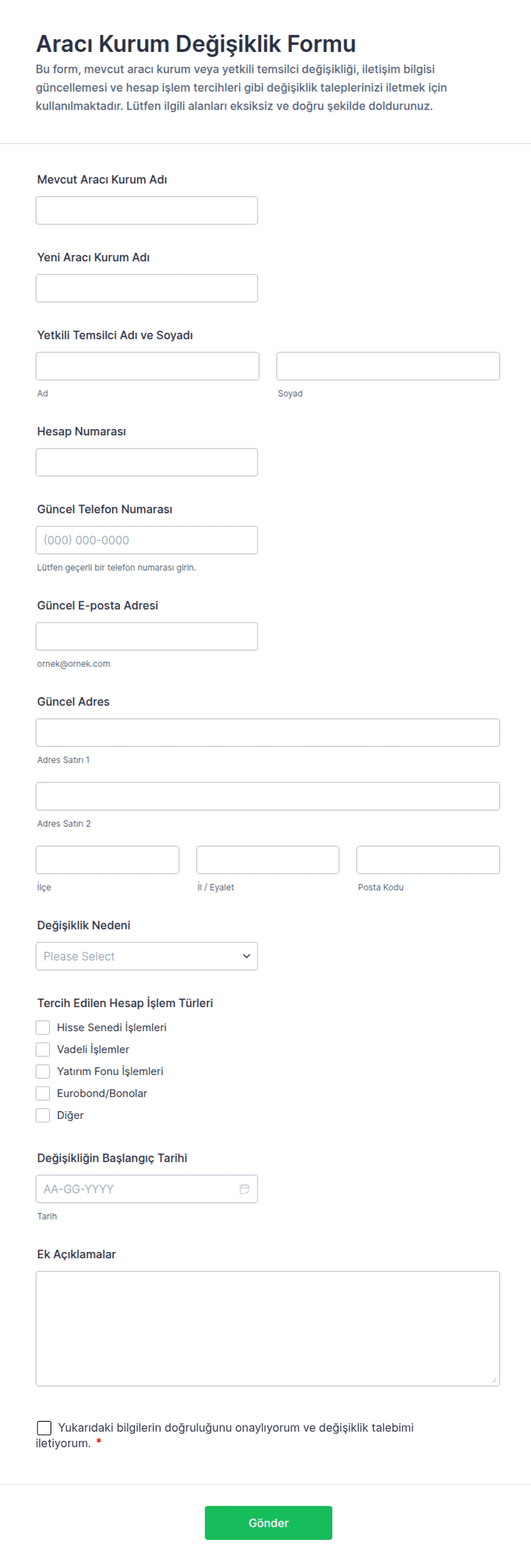 Broker formu, aracıların müşteriler, işlemler, mülkler veya poliçelerle ilgili bilgileri toplamak, işlemek ve yönetmek için kullandığı dijital bir belgedir. Veri girişini kolaylaştırır ve sektör standartlarına uyumu sağlar.