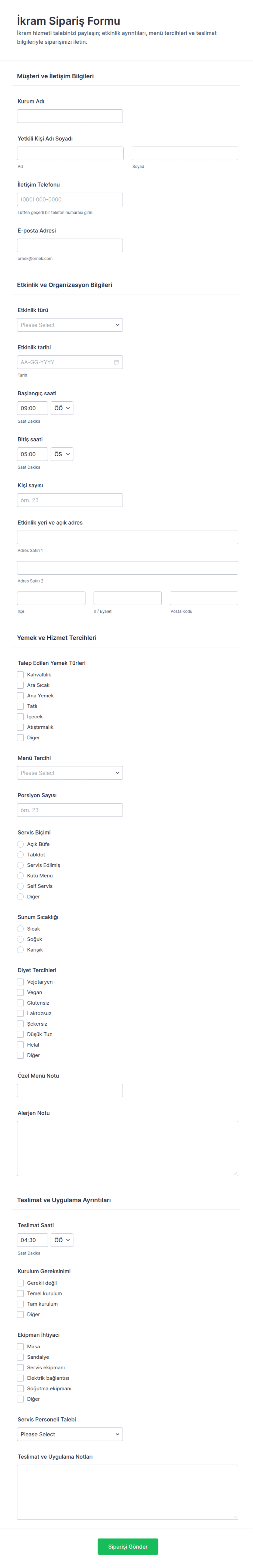 - Düğün İkramı: Formlar menü seçimi, misafir sayısı, oturma düzeni ve özel diyet gereksinimleri için alanlar içerebilir.