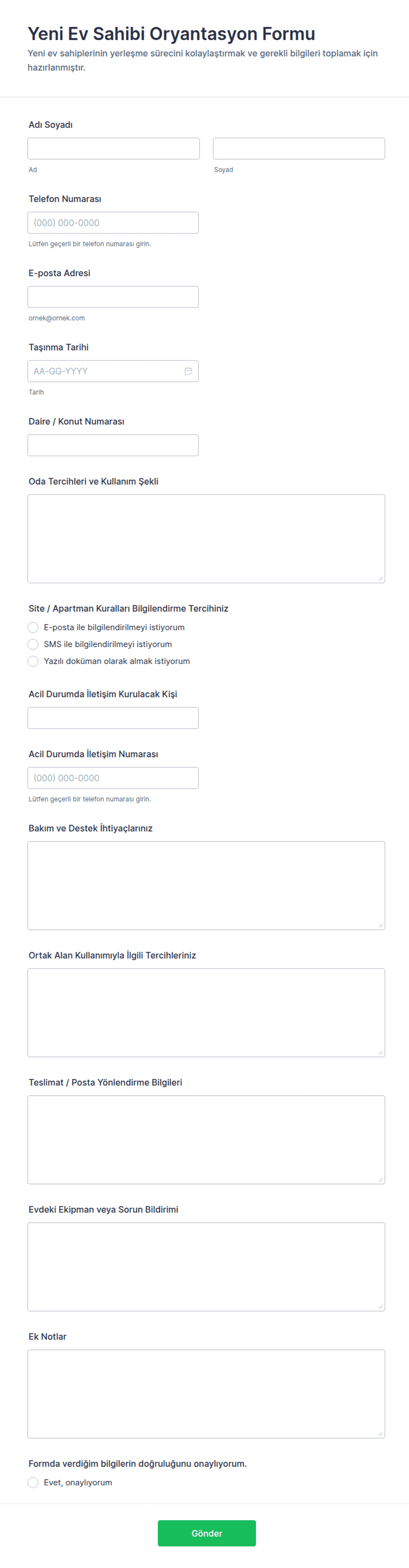 - Bakım Talepleri: Kiracı adı, daire numarası, sorun açıklaması, aciliyet seviyesi, fotoğraflar için dosya yüklemesi