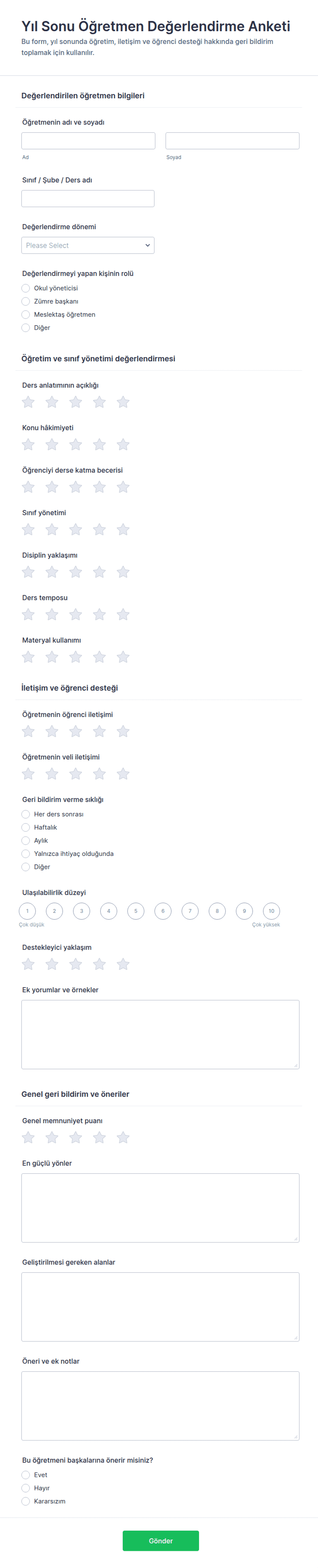 Bu adımları takip ederek, eğitim topluluğunuzda sürekli gelişim ve profesyonel ilerlemeyi destekleyen, hem kapsamlı hem de kullanımı kolay bir Öğretmen Değerlendirme Formu oluşturabilirsiniz.