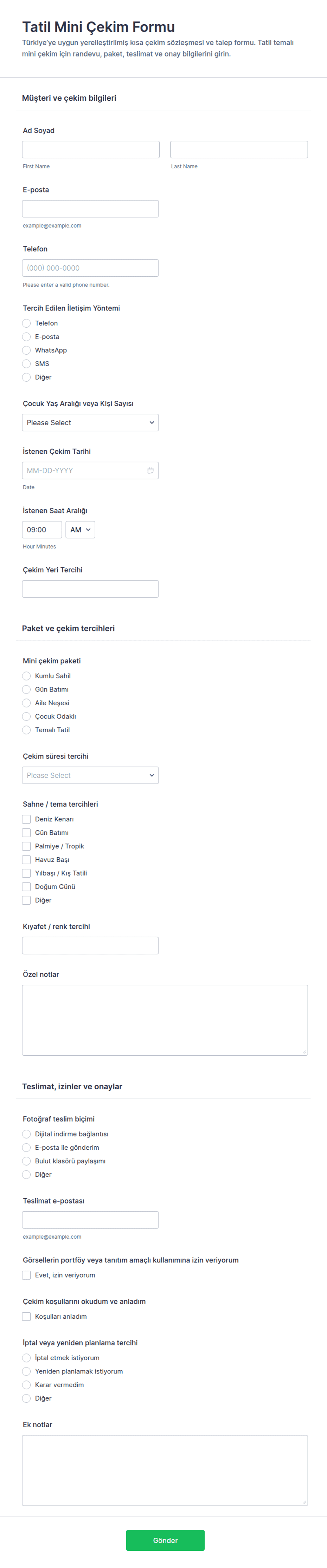 • Portre Çekimleri: Katılımcı sayısı, lokasyon tercihleri ve paket seçimi için alanlar içerebilir.